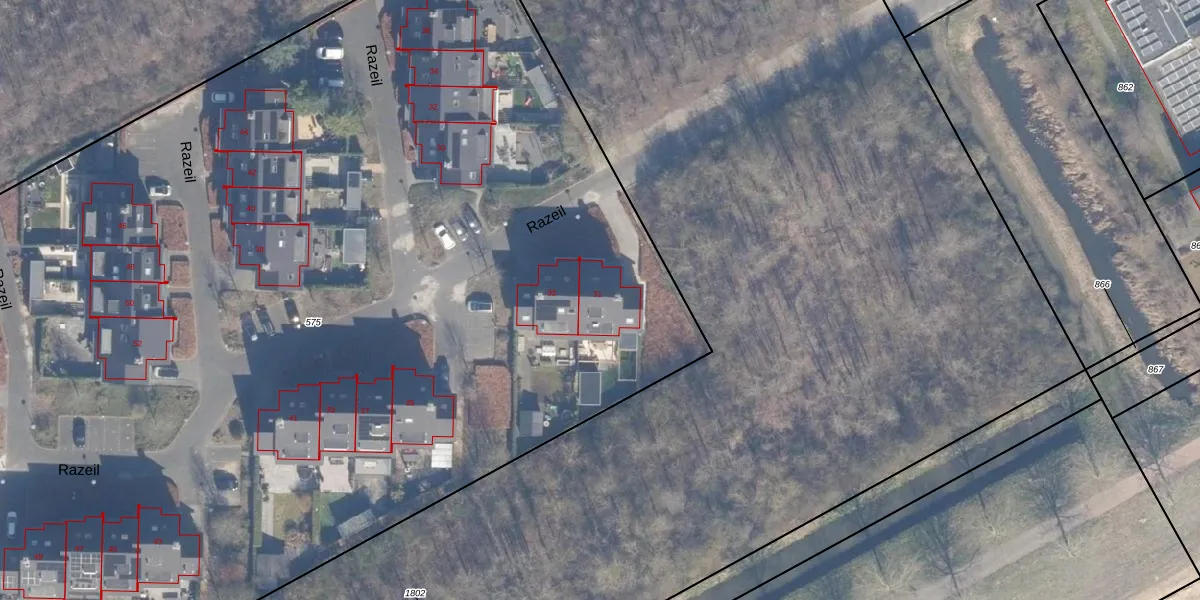 Het perceel waarop Razeil 31 staat heeft een oppervlakte van 1,0 ha. Dit is een zeer groot perceel. De perceeloppervlakte wordt geregistreerd door het Kadaster. Gedetailleerde informatie over de maten van dit perceel kunt u vinden in het rapport Kadastrale kaart met maatvoering van Razeil 31.