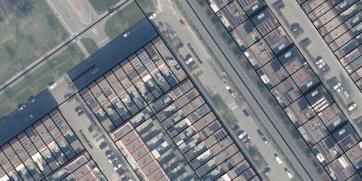 Rodosstraat 53 is gelegen op kadastraal perceel AMR04B6832. Deze kadastrale aanduiding is uniek en wordt gebruikt door het Kadaster om eigendomsrechten en andere zakelijke rechten vast te leggen. Het perceel maakt onderdeel uit van de kadastrale gemeente Almere.