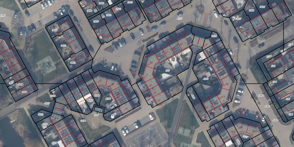 Het perceel waarop Rozenwerf 121 staat heeft een oppervlakte van 1326 m². Dit is een zeer groot perceel. De perceeloppervlakte wordt geregistreerd door het Kadaster. Gedetailleerde informatie over de maten van dit perceel kunt u vinden in het rapport Kadastrale kaart met maatvoering van Rozenwerf 121.