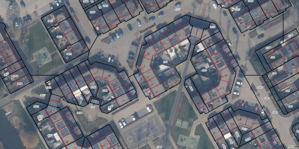 Het perceel waarop Rozenwerf 123 staat heeft een oppervlakte van 1326 m². Dit is een zeer groot perceel. De perceeloppervlakte wordt geregistreerd door het Kadaster. Gedetailleerde informatie over de maten van dit perceel kunt u vinden in het rapport Kadastrale kaart met maatvoering van Rozenwerf 123.