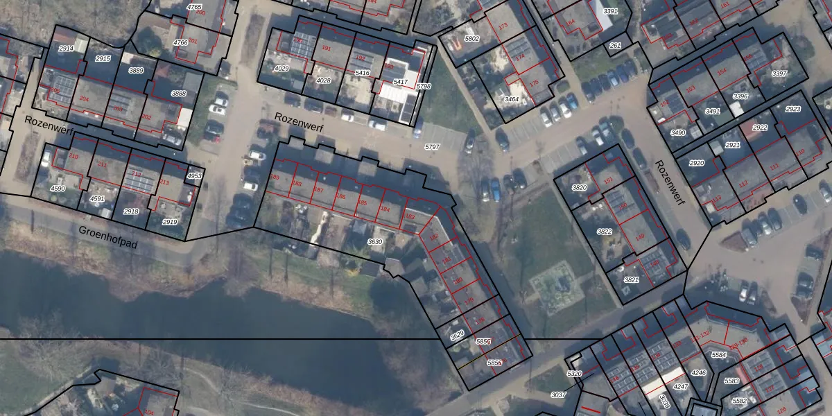 Het perceel waarop Rozenwerf 183 staat heeft een oppervlakte van 1284 m². Dit is een zeer groot perceel. De perceeloppervlakte wordt geregistreerd door het Kadaster. Gedetailleerde informatie over de maten van dit perceel kunt u vinden in het rapport Kadastrale kaart met maatvoering van Rozenwerf 183.