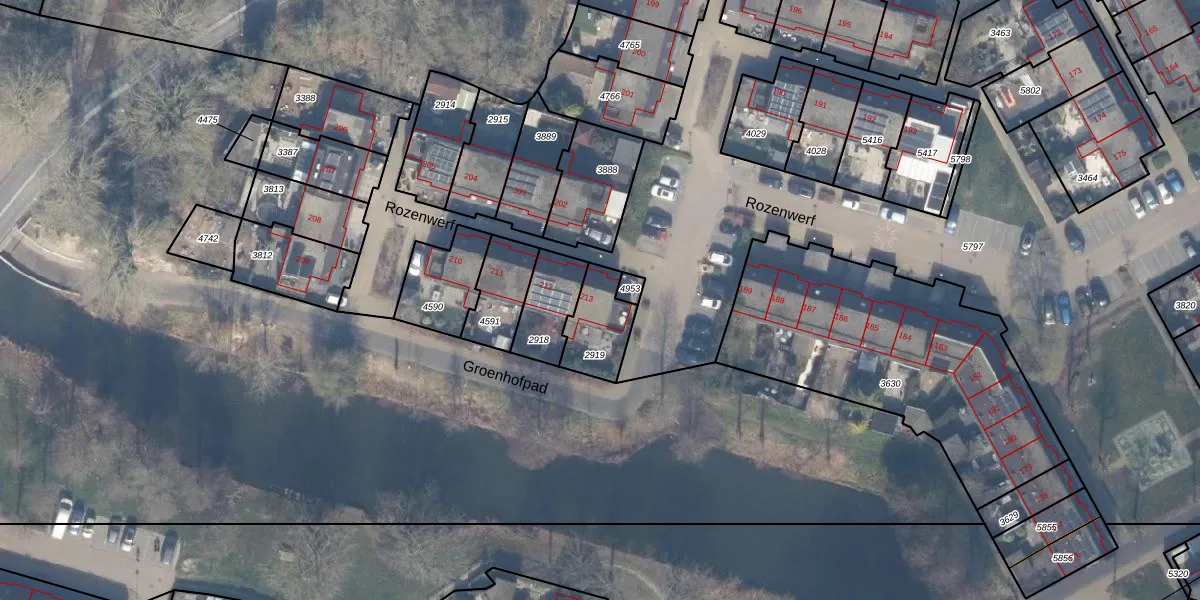 Het perceel waarop Rozenwerf 213 staat heeft een oppervlakte van 163 m². Dit is een middelgroot perceel. De perceeloppervlakte wordt geregistreerd door het Kadaster. Gedetailleerde informatie over de maten van dit perceel kunt u vinden in het rapport Kadastrale kaart met maatvoering van Rozenwerf 213.