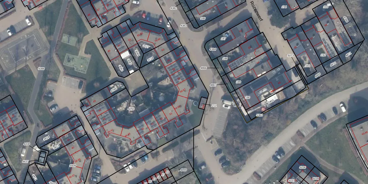 Het perceel waarop Rozenwerf 57 staat heeft een oppervlakte van 2241 m². Dit is een zeer groot perceel. De perceeloppervlakte wordt geregistreerd door het Kadaster. Gedetailleerde informatie over de maten van dit perceel kunt u vinden in het rapport Kadastrale kaart met maatvoering van Rozenwerf 57.