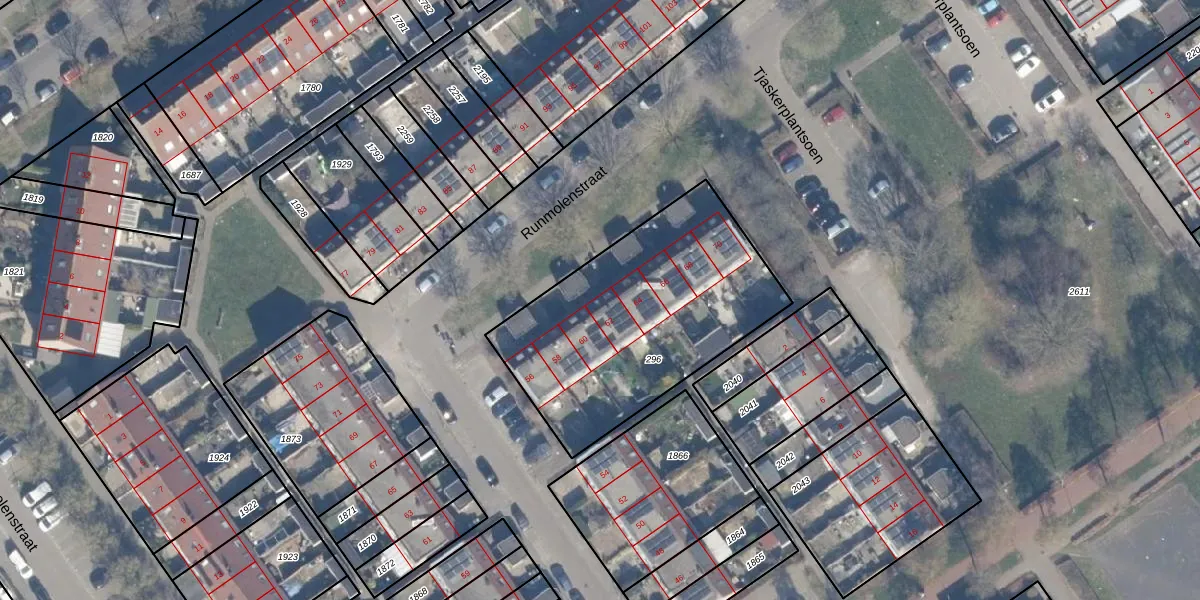 Het perceel waarop Runmolenstraat 62 staat heeft een oppervlakte van 1133 m². Dit is een zeer groot perceel. De perceeloppervlakte wordt geregistreerd door het Kadaster. Gedetailleerde informatie over de maten van dit perceel kunt u vinden in het rapport Kadastrale kaart met maatvoering van Runmolenstraat 62.
