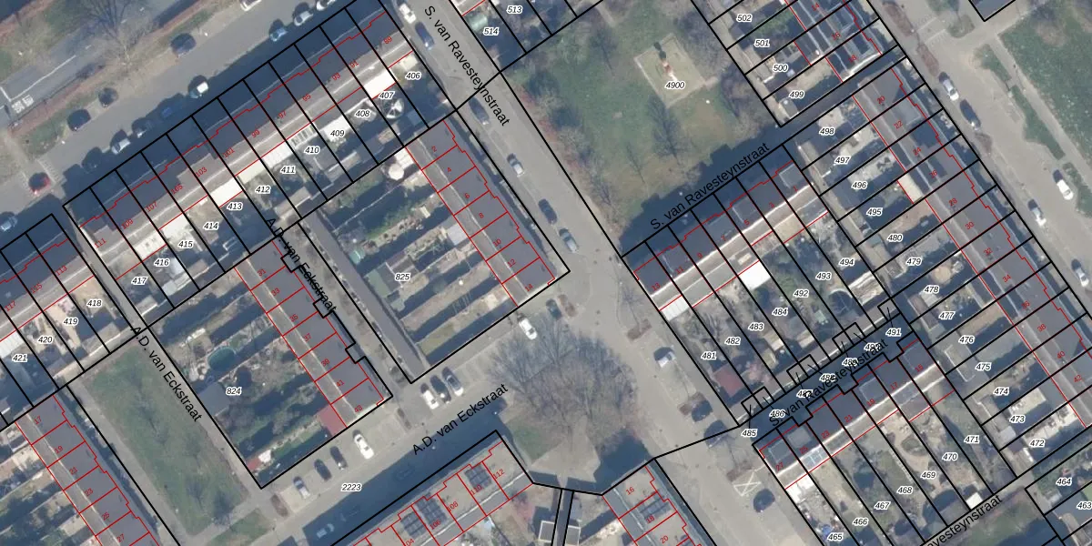 S. van Ravesteynstraat 14 is gelegen op kadastraal perceel AMR04P825. Deze kadastrale aanduiding is uniek en wordt gebruikt door het Kadaster om eigendomsrechten en andere zakelijke rechten vast te leggen. Het perceel maakt onderdeel uit van de kadastrale gemeente Almere.