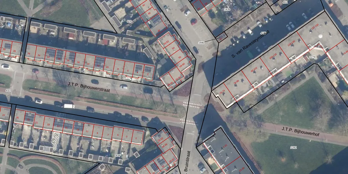 Het perceel waarop S. van Ravesteynstraat 66 staat heeft een oppervlakte van 3926 m². Dit is een zeer groot perceel. De perceeloppervlakte wordt geregistreerd door het Kadaster. Gedetailleerde informatie over de maten van dit perceel kunt u vinden in het rapport Kadastrale kaart met maatvoering van S. van Ravesteynstraat 66.