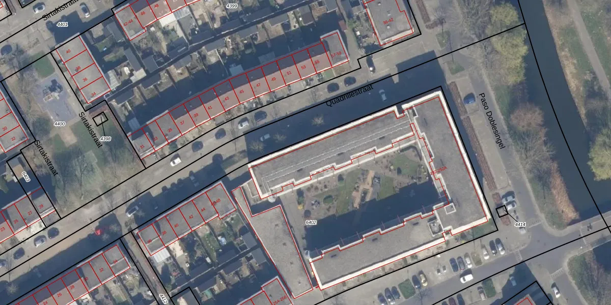 Het adres is gelegen op perceel 6402 in de sectie U en de kadastrale gemeente Almere. De kadastrale aanduiding is aldus AMR04-U-6402. Het perceel is met 5333 m² relatief groot. Het gemiddelde ligt in de kadastrale gemeente Almere op 3328,15 m². Het grootste perceel in de kadastrale gemeente is 32,12 km². Het kleinste perceel heeft een oppervlakte van 0 m². Op het perceel liggen in totaal 75 adressen. De huidige grenzen van het perceel zijn digitaal in de Basisregistratie Kadaster (BRK) geregistreerd op 02-12-2003.