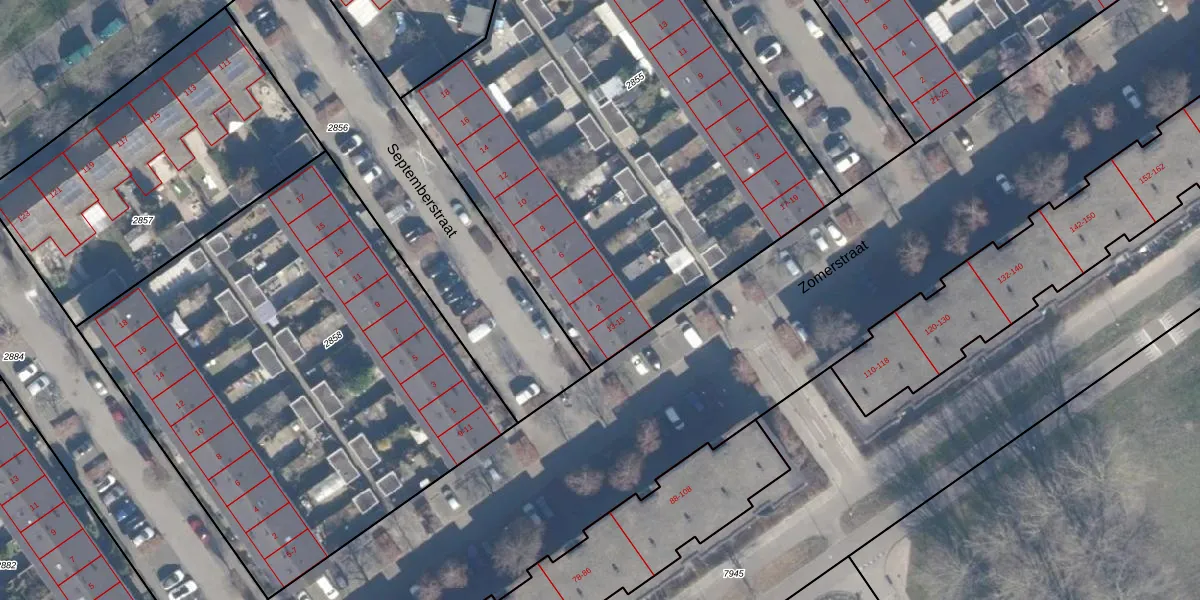 Het perceel waarop Septemberstraat 2 staat heeft een oppervlakte van 2989 m². Dit is een zeer groot perceel. De perceeloppervlakte wordt geregistreerd door het Kadaster. Gedetailleerde informatie over de maten van dit perceel kunt u vinden in het rapport Kadastrale kaart met maatvoering van Septemberstraat 2.