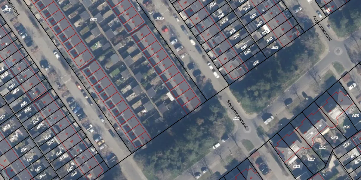 Het perceel waarop Septemberstraat 75 staat heeft een oppervlakte van 5666 m². Dit is een zeer groot perceel. De perceeloppervlakte wordt geregistreerd door het Kadaster. Gedetailleerde informatie over de maten van dit perceel kunt u vinden in het rapport Kadastrale kaart met maatvoering van Septemberstraat 75.