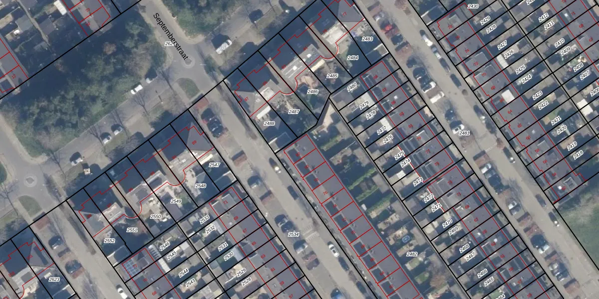 Het perceel waarop Septemberstraat 82 staat heeft een oppervlakte van 2440 m². Dit is een zeer groot perceel. De perceeloppervlakte wordt geregistreerd door het Kadaster. Gedetailleerde informatie over de maten van dit perceel kunt u vinden in het rapport Kadastrale kaart met maatvoering van Septemberstraat 82.
