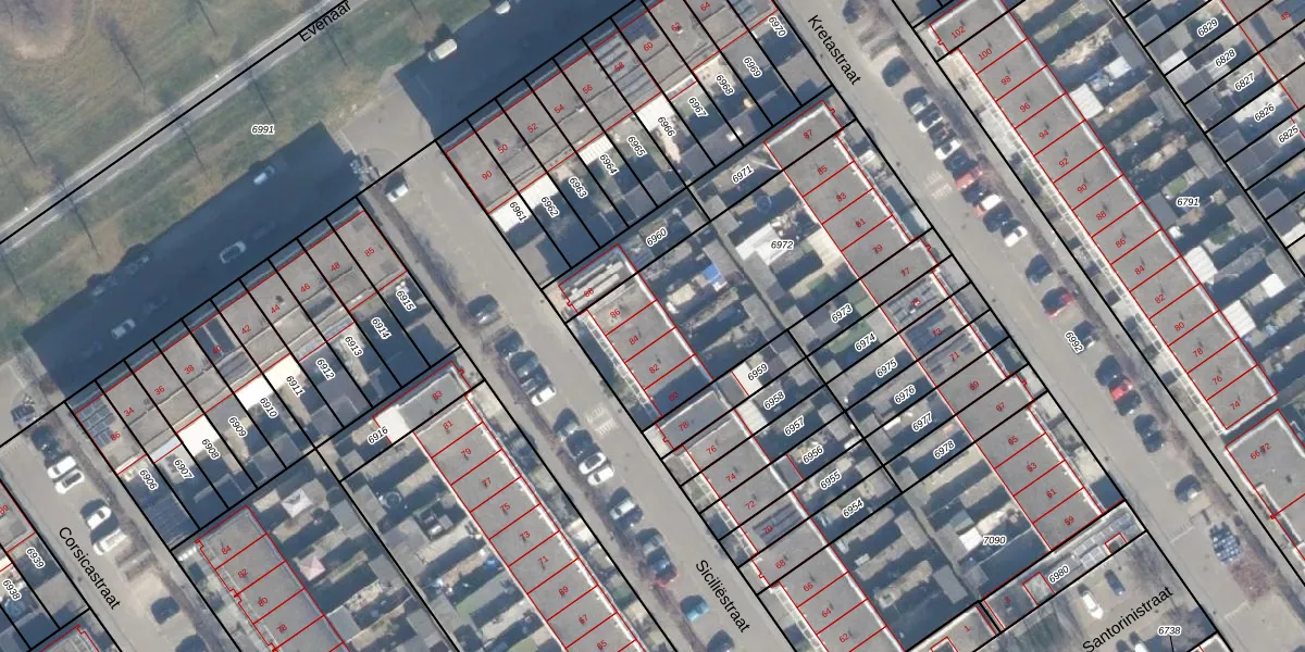 Het perceel waarop Siciliëstraat 84 staat heeft een oppervlakte van 1116 m². Dit is een zeer groot perceel. De perceeloppervlakte wordt geregistreerd door het Kadaster. Gedetailleerde informatie over de maten van dit perceel kunt u vinden in het rapport Kadastrale kaart met maatvoering van Siciliëstraat 84.