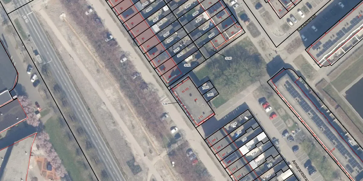 Het perceel waarop het adres ligt is AMR04-B-538. De afkorting 'AMR04' staat voor kadastrale gemeente Almere. Het perceel is kleiner dan gemiddeld in Almere. Het perceel is 336 m² groot, terwijl het gemiddelde ligt op 3329,36 m². Het grootste perceel in de kadastrale gemeente is 32,12 km². Het kleinste perceel heeft een oppervlakte van 0 m². Op het perceel liggen in totaal 14 adressen. In de Basisregistratie Kadaster (BRK) werden de grenzen van het perceel geregistreerd op 19-09-2023.