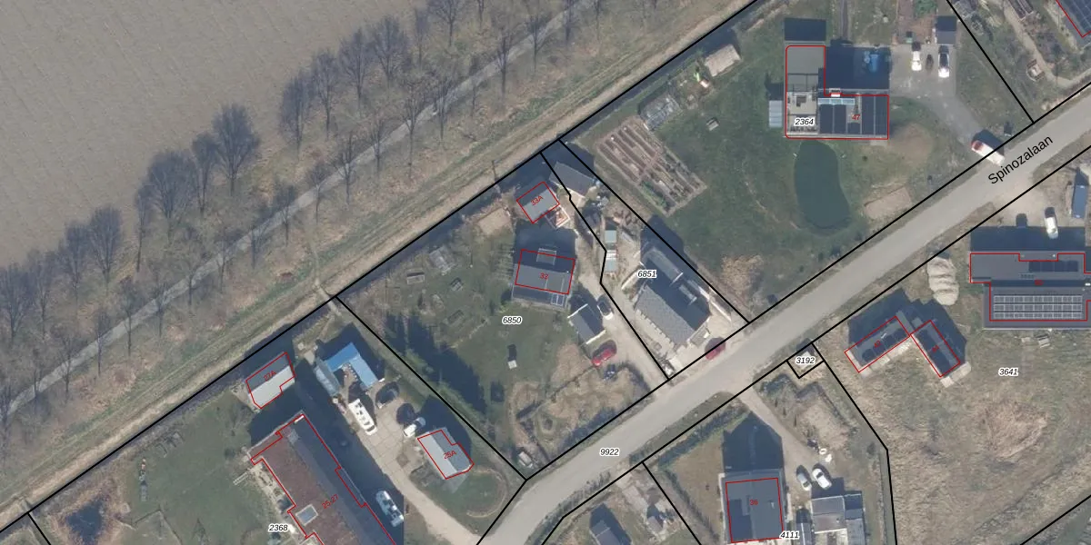 Het perceel waarop Spinozalaan 33 staat heeft een oppervlakte van 1851 m². Dit is een zeer groot perceel. De perceeloppervlakte wordt geregistreerd door het Kadaster. Gedetailleerde informatie over de maten van dit perceel kunt u vinden in het rapport Kadastrale kaart met maatvoering van Spinozalaan 33.