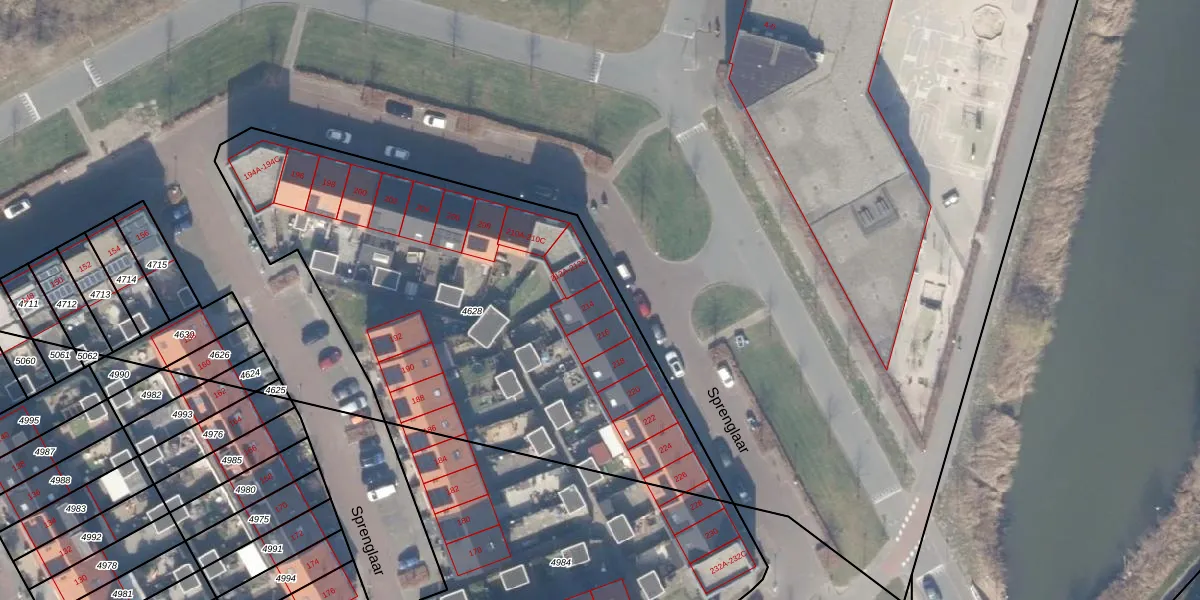 Het perceel waarop Sprenglaar 214 staat heeft een oppervlakte van 2555 m². Dit is een zeer groot perceel. De perceeloppervlakte wordt geregistreerd door het Kadaster. Gedetailleerde informatie over de maten van dit perceel kunt u vinden in het rapport Kadastrale kaart met maatvoering van Sprenglaar 214.