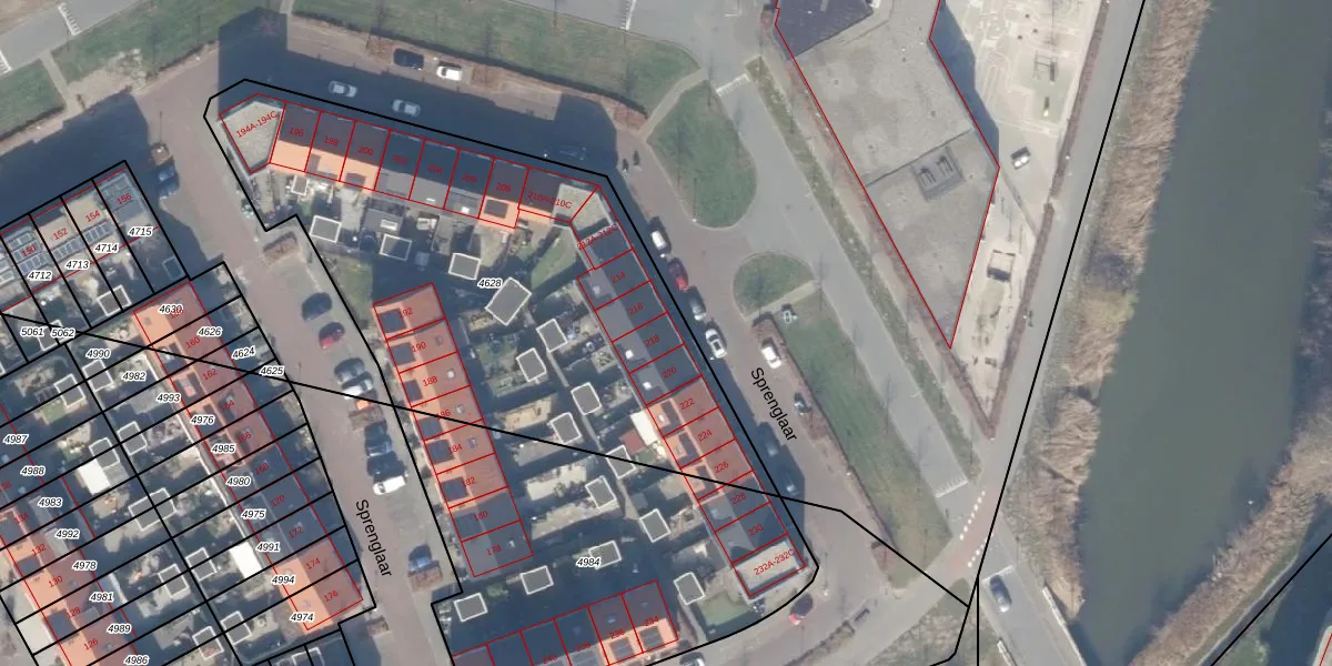 Het perceel waarop Sprenglaar 218 staat heeft een oppervlakte van 2555 m². Dit is een zeer groot perceel. De perceeloppervlakte wordt geregistreerd door het Kadaster. Gedetailleerde informatie over de maten van dit perceel kunt u vinden in het rapport Kadastrale kaart met maatvoering van Sprenglaar 218.