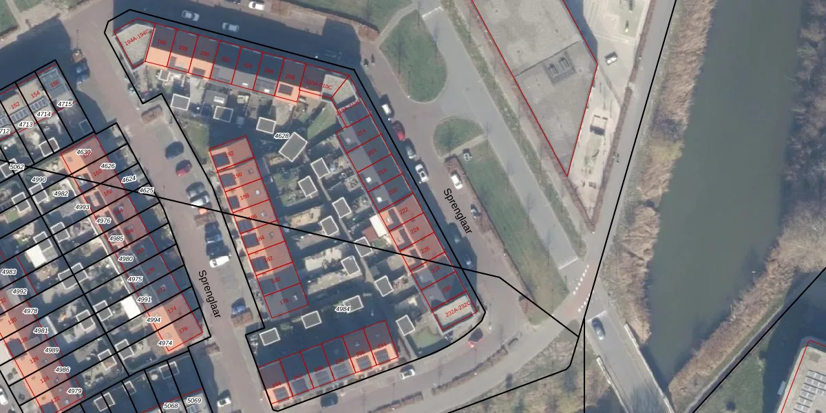 Het perceel waarop Sprenglaar 222 staat heeft een oppervlakte van 2555 m². Dit is een zeer groot perceel. De perceeloppervlakte wordt geregistreerd door het Kadaster. Gedetailleerde informatie over de maten van dit perceel kunt u vinden in het rapport Kadastrale kaart met maatvoering van Sprenglaar 222.