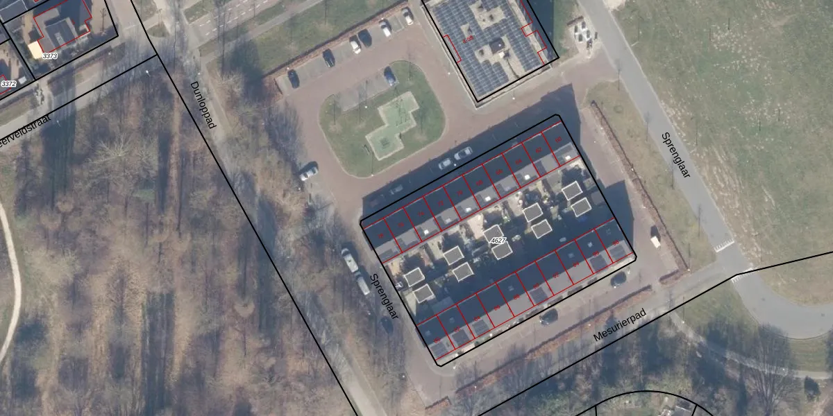 Sprenglaar 74 is gelegen op kadastraal perceel AMR04G4627. Deze kadastrale aanduiding is uniek en wordt gebruikt door het Kadaster om eigendomsrechten en andere zakelijke rechten vast te leggen. Het perceel maakt onderdeel uit van de kadastrale gemeente Almere.