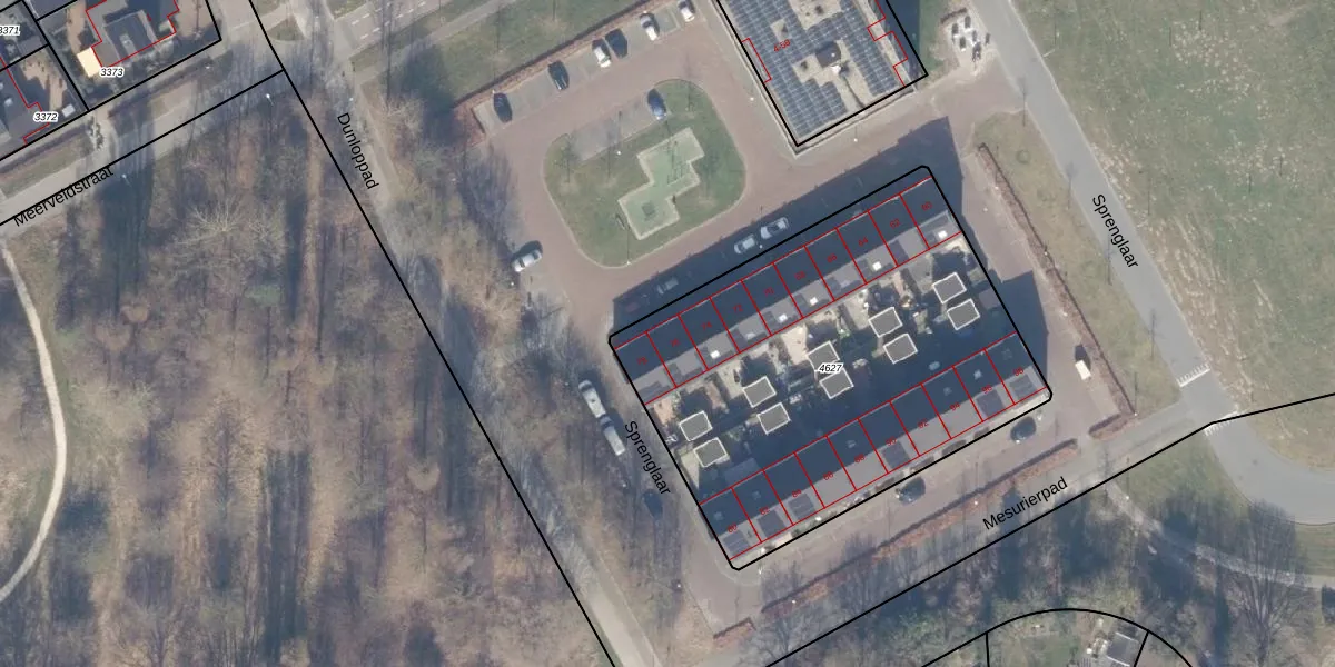 Sprenglaar 76 is gelegen op kadastraal perceel AMR04G4627. Deze kadastrale aanduiding is uniek en wordt gebruikt door het Kadaster om eigendomsrechten en andere zakelijke rechten vast te leggen. Het perceel maakt onderdeel uit van de kadastrale gemeente Almere.