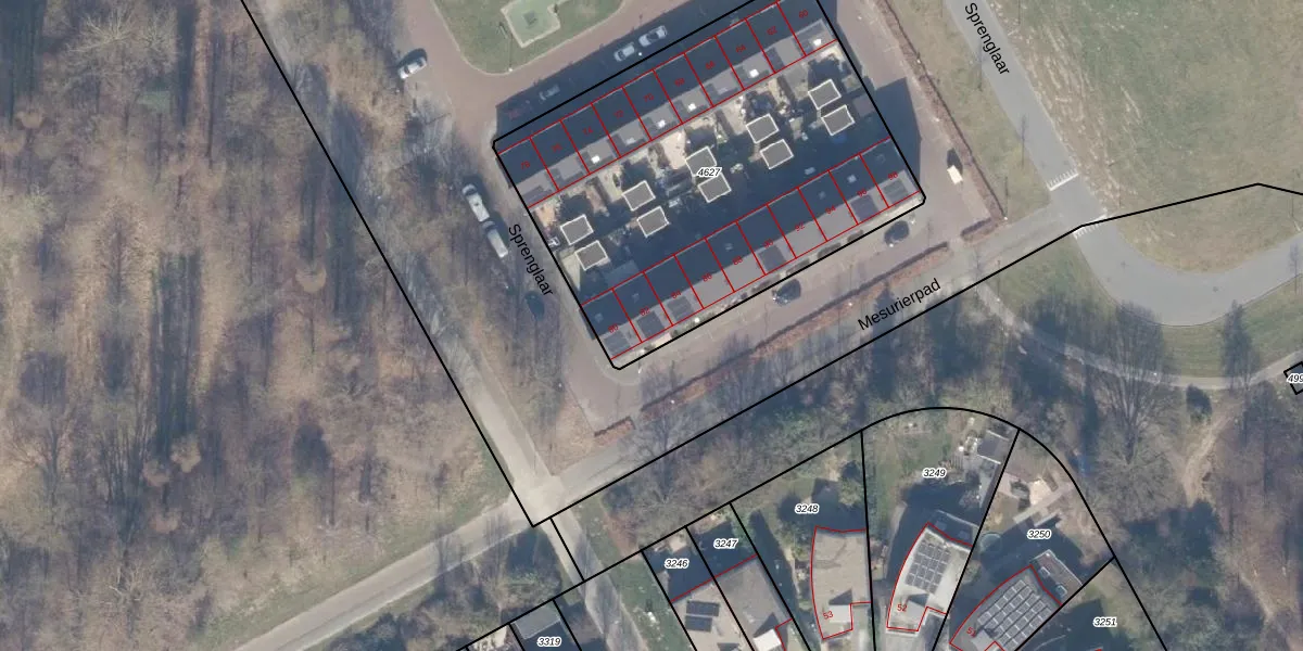 Het perceel waarop Sprenglaar 82 staat heeft een oppervlakte van 2175 m². Dit is een zeer groot perceel. De perceeloppervlakte wordt geregistreerd door het Kadaster. Gedetailleerde informatie over de maten van dit perceel kunt u vinden in het rapport Kadastrale kaart met maatvoering van Sprenglaar 82.