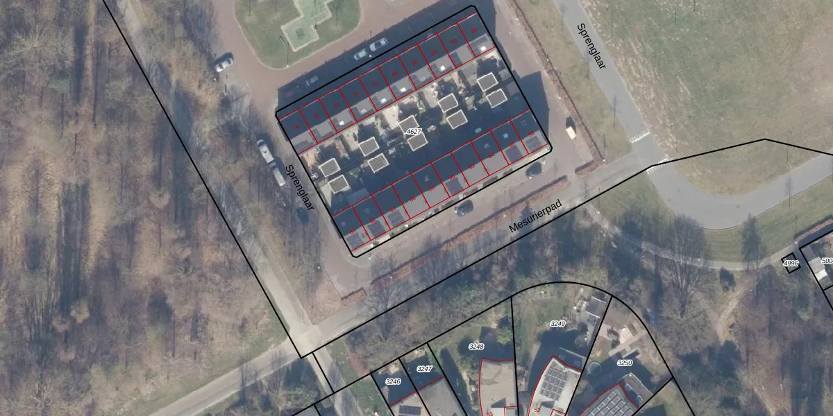 Het perceel waarop Sprenglaar 86 staat heeft een oppervlakte van 2175 m². Dit is een zeer groot perceel. De perceeloppervlakte wordt geregistreerd door het Kadaster. Gedetailleerde informatie over de maten van dit perceel kunt u vinden in het rapport Kadastrale kaart met maatvoering van Sprenglaar 86.