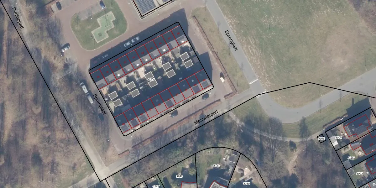 Het perceel waarop Sprenglaar 94 staat heeft een oppervlakte van 2175 m². Dit is een zeer groot perceel. De perceeloppervlakte wordt geregistreerd door het Kadaster. Gedetailleerde informatie over de maten van dit perceel kunt u vinden in het rapport Kadastrale kaart met maatvoering van Sprenglaar 94.