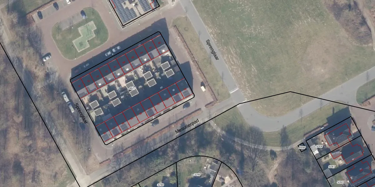 Het perceel waarop Sprenglaar 98 staat heeft een oppervlakte van 2175 m². Dit is een zeer groot perceel. De perceeloppervlakte wordt geregistreerd door het Kadaster. Gedetailleerde informatie over de maten van dit perceel kunt u vinden in het rapport Kadastrale kaart met maatvoering van Sprenglaar 98.