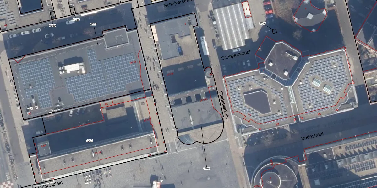 Het perceel waarop Stadhuisplein 13-B staat heeft een oppervlakte van 1632 m². Dit is een zeer groot perceel. De perceeloppervlakte wordt geregistreerd door het Kadaster. Gedetailleerde informatie over de maten van dit perceel kunt u vinden in het rapport Kadastrale kaart met maatvoering van Stadhuisplein 13-B.
