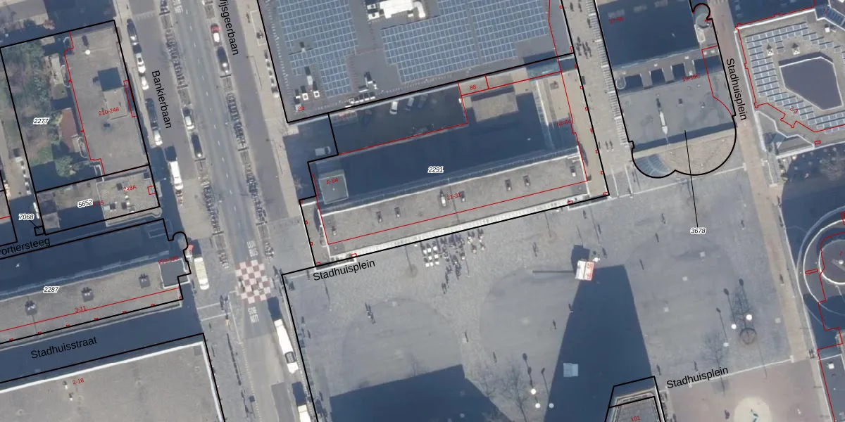 Het perceel waarop Stadhuisplein 28 staat heeft een oppervlakte van 2331 m². Dit is een zeer groot perceel. De perceeloppervlakte wordt geregistreerd door het Kadaster. Gedetailleerde informatie over de maten van dit perceel kunt u vinden in het rapport Kadastrale kaart met maatvoering van Stadhuisplein 28.