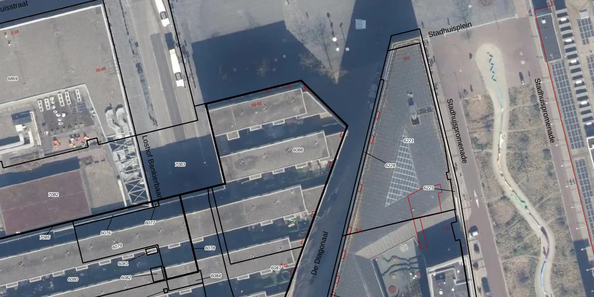 Het perceel waarop Stadhuisplein 54 staat heeft een oppervlakte van 1993 m². Dit is een zeer groot perceel. De perceeloppervlakte wordt geregistreerd door het Kadaster. Gedetailleerde informatie over de maten van dit perceel kunt u vinden in het rapport Kadastrale kaart met maatvoering van Stadhuisplein 54.