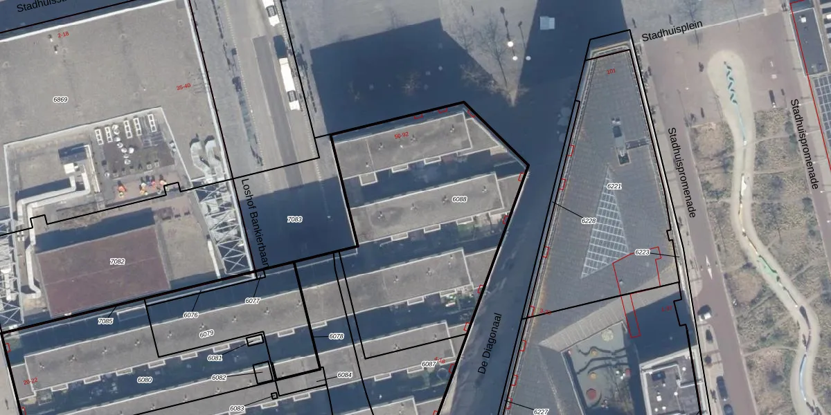 Het perceel waarop Stadhuisplein 55 staat heeft een oppervlakte van 1993 m². Dit is een zeer groot perceel. De perceeloppervlakte wordt geregistreerd door het Kadaster. Gedetailleerde informatie over de maten van dit perceel kunt u vinden in het rapport Kadastrale kaart met maatvoering van Stadhuisplein 55.