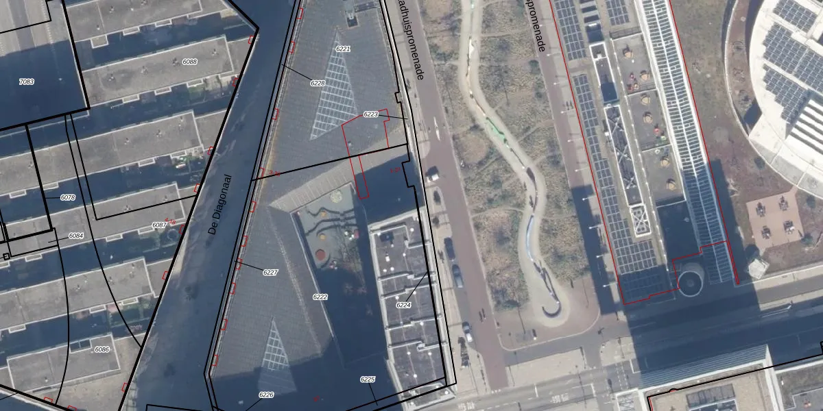 Het perceel waarop Stadhuispromenade 29 staat heeft een oppervlakte van 2887 m². Dit is een zeer groot perceel. De perceeloppervlakte wordt geregistreerd door het Kadaster. Gedetailleerde informatie over de maten van dit perceel kunt u vinden in het rapport Kadastrale kaart met maatvoering van Stadhuispromenade 29.