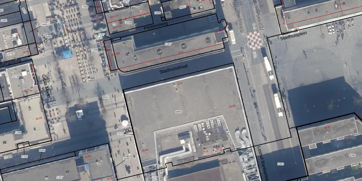 Het perceel waarop Stadhuisstraat 10 staat heeft een oppervlakte van 2955 m². Dit is een zeer groot perceel. De perceeloppervlakte wordt geregistreerd door het Kadaster. Gedetailleerde informatie over de maten van dit perceel kunt u vinden in het rapport Kadastrale kaart met maatvoering van Stadhuisstraat 10.