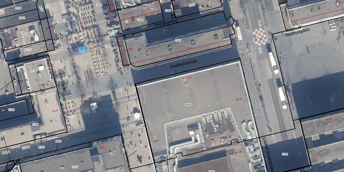 Het perceel waarop Stadhuisstraat 6 staat heeft een oppervlakte van 2955 m². Dit is een zeer groot perceel. De perceeloppervlakte wordt geregistreerd door het Kadaster. Gedetailleerde informatie over de maten van dit perceel kunt u vinden in het rapport Kadastrale kaart met maatvoering van Stadhuisstraat 6.