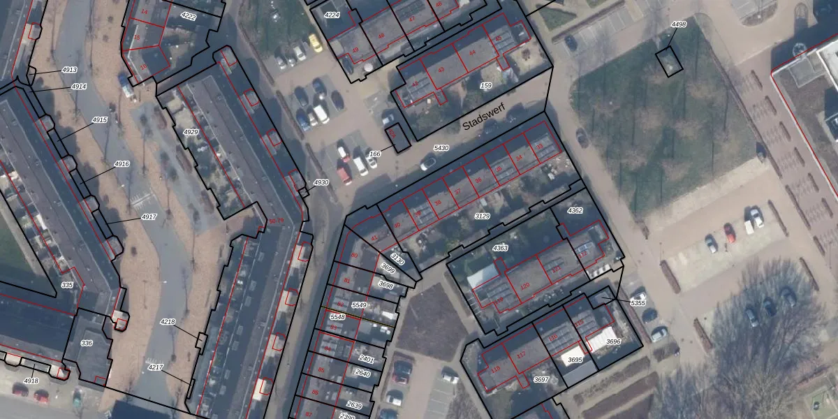 Het perceel waarop Stadswerf 39 staat heeft een oppervlakte van 858 m². Dit is een groot perceel. De perceeloppervlakte wordt geregistreerd door het Kadaster. Gedetailleerde informatie over de maten van dit perceel kunt u vinden in het rapport Kadastrale kaart met maatvoering van Stadswerf 39.