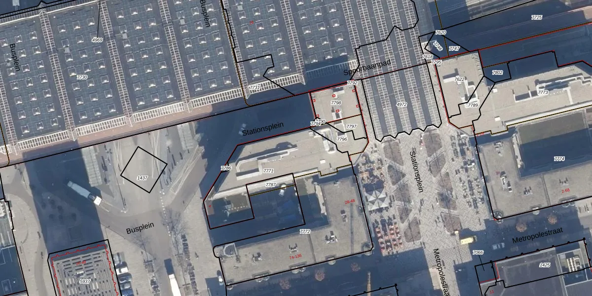 Het perceel waarop Stationsplein 38-E staat heeft een oppervlakte van 728 m². Dit is een groot perceel. De perceeloppervlakte wordt geregistreerd door het Kadaster. Gedetailleerde informatie over de maten van dit perceel kunt u vinden in het rapport Kadastrale kaart met maatvoering van Stationsplein 38-E.