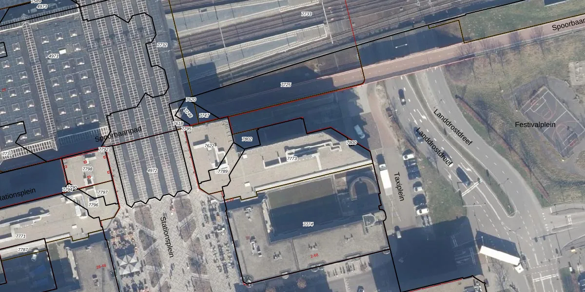 Het perceel waarop Stationsplein 8-F staat heeft een oppervlakte van 765 m². Dit is een groot perceel. De perceeloppervlakte wordt geregistreerd door het Kadaster. Gedetailleerde informatie over de maten van dit perceel kunt u vinden in het rapport Kadastrale kaart met maatvoering van Stationsplein 8-F.
