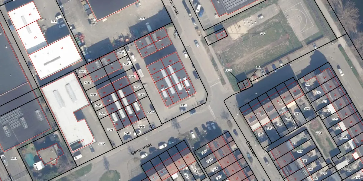 Het perceel waarop Steurstraat 5-G staat heeft een oppervlakte van 1436 m². Dit is een zeer groot perceel. De perceeloppervlakte wordt geregistreerd door het Kadaster. Gedetailleerde informatie over de maten van dit perceel kunt u vinden in het rapport Kadastrale kaart met maatvoering van Steurstraat 5-G.