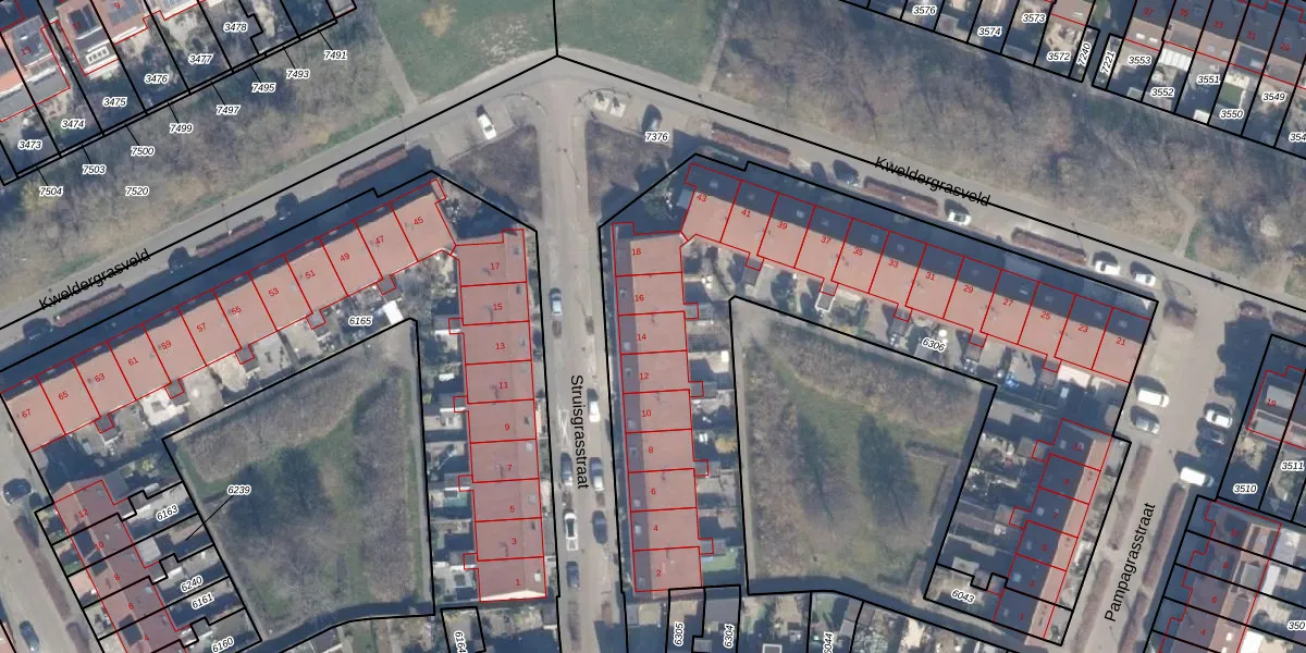 Het perceel waarop Struisgrasstraat 14 staat heeft een oppervlakte van 3551 m². Dit is een zeer groot perceel. De perceeloppervlakte wordt geregistreerd door het Kadaster. Gedetailleerde informatie over de maten van dit perceel kunt u vinden in het rapport Kadastrale kaart met maatvoering van Struisgrasstraat 14.