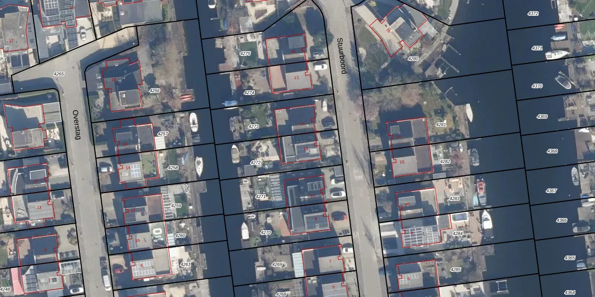 Het perceel waarop Stuurboord 13 staat heeft een oppervlakte van 501 m². Dit is een groot perceel. De perceeloppervlakte wordt geregistreerd door het Kadaster. Gedetailleerde informatie over de maten van dit perceel kunt u vinden in het rapport Kadastrale kaart met maatvoering van Stuurboord 13.