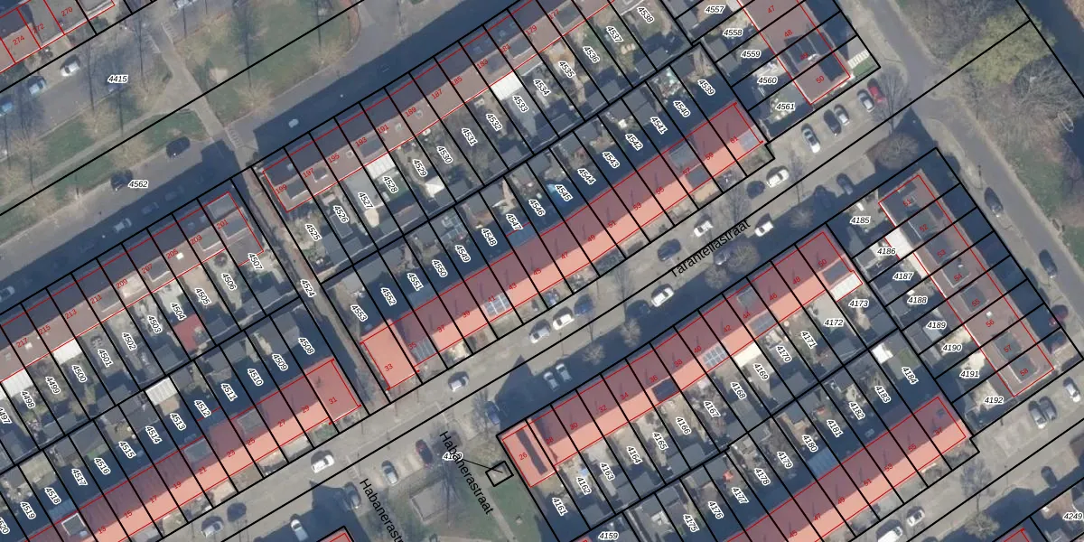 Het perceel waarop Tarantellastraat 45 staat heeft een oppervlakte van 138 m². Dit is een middelgroot perceel. De perceeloppervlakte wordt geregistreerd door het Kadaster. Gedetailleerde informatie over de maten van dit perceel kunt u vinden in het rapport Kadastrale kaart met maatvoering van Tarantellastraat 45.