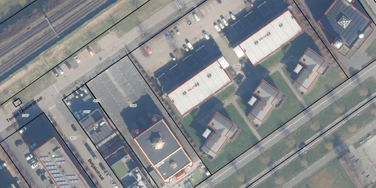 Het perceel waarop Tempo Doeloestraat 261 staat heeft een oppervlakte van 6905 m². Dit is een zeer groot perceel. De perceeloppervlakte wordt geregistreerd door het Kadaster. Gedetailleerde informatie over de maten van dit perceel kunt u vinden in het rapport Kadastrale kaart met maatvoering van Tempo Doeloestraat 261.