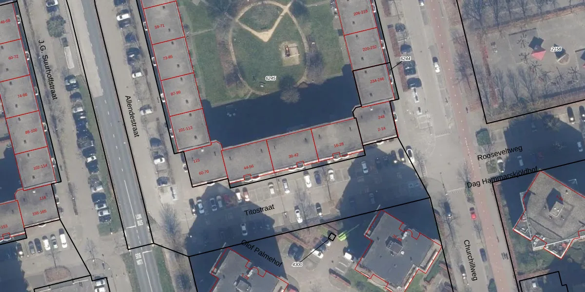 Het perceel waarop Titostraat 36 staat heeft een oppervlakte van 6040 m². Dit is een zeer groot perceel. De perceeloppervlakte wordt geregistreerd door het Kadaster. Gedetailleerde informatie over de maten van dit perceel kunt u vinden in het rapport Kadastrale kaart met maatvoering van Titostraat 36.