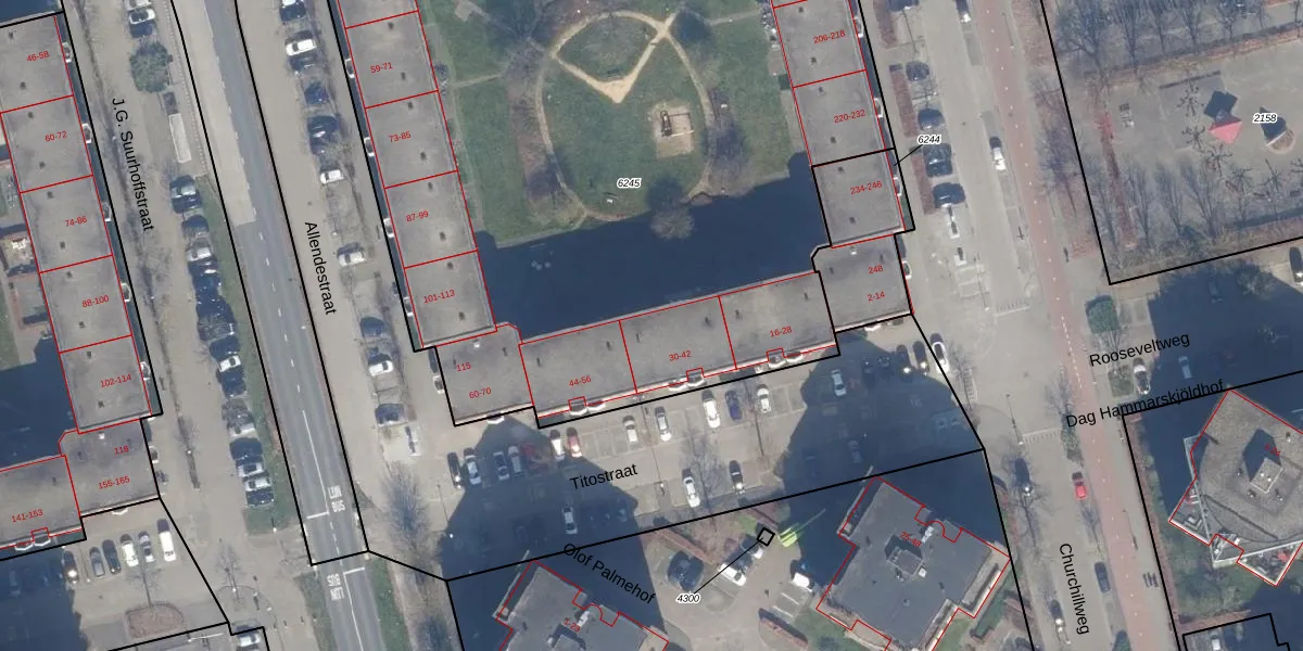 Het perceel waarop Titostraat 42 staat heeft een oppervlakte van 6040 m². Dit is een zeer groot perceel. De perceeloppervlakte wordt geregistreerd door het Kadaster. Gedetailleerde informatie over de maten van dit perceel kunt u vinden in het rapport Kadastrale kaart met maatvoering van Titostraat 42.