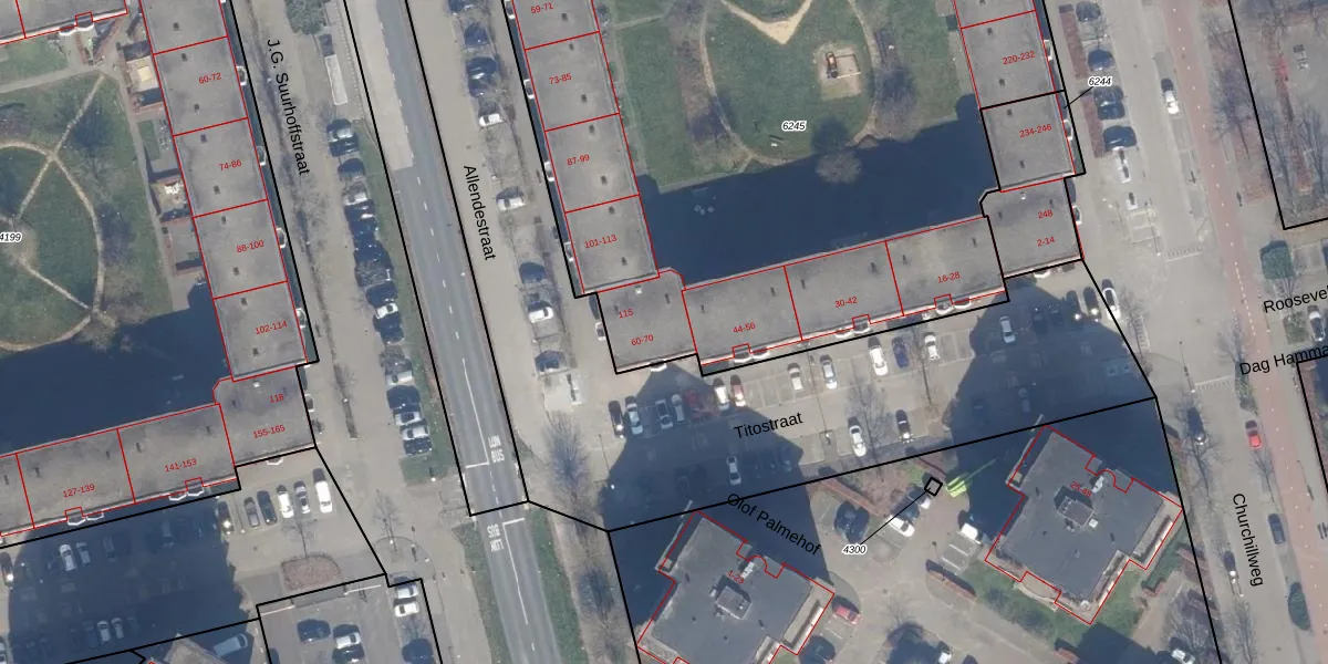Het perceel waarop Titostraat 60 staat heeft een oppervlakte van 6040 m². Dit is een zeer groot perceel. De perceeloppervlakte wordt geregistreerd door het Kadaster. Gedetailleerde informatie over de maten van dit perceel kunt u vinden in het rapport Kadastrale kaart met maatvoering van Titostraat 60.