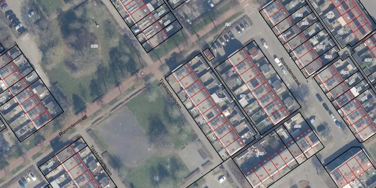 Het perceel waarop Tjaskerplantsoen 21 staat heeft een oppervlakte van 1249 m². Dit is een zeer groot perceel. De perceeloppervlakte wordt geregistreerd door het Kadaster. Gedetailleerde informatie over de maten van dit perceel kunt u vinden in het rapport Kadastrale kaart met maatvoering van Tjaskerplantsoen 21.