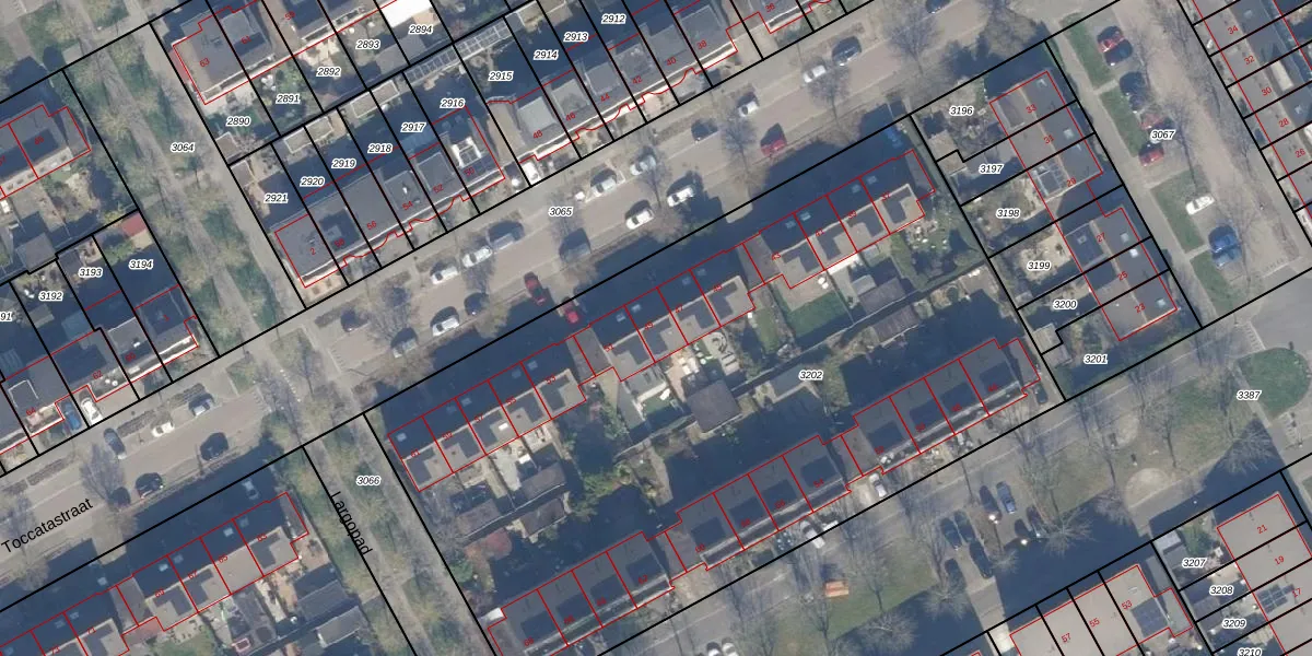 Toccatastraat 49 is gelegen op kadastraal perceel AMR04Q3202. Deze kadastrale aanduiding is uniek en wordt gebruikt door het Kadaster om eigendomsrechten en andere zakelijke rechten vast te leggen. Het perceel maakt onderdeel uit van de kadastrale gemeente Almere.
