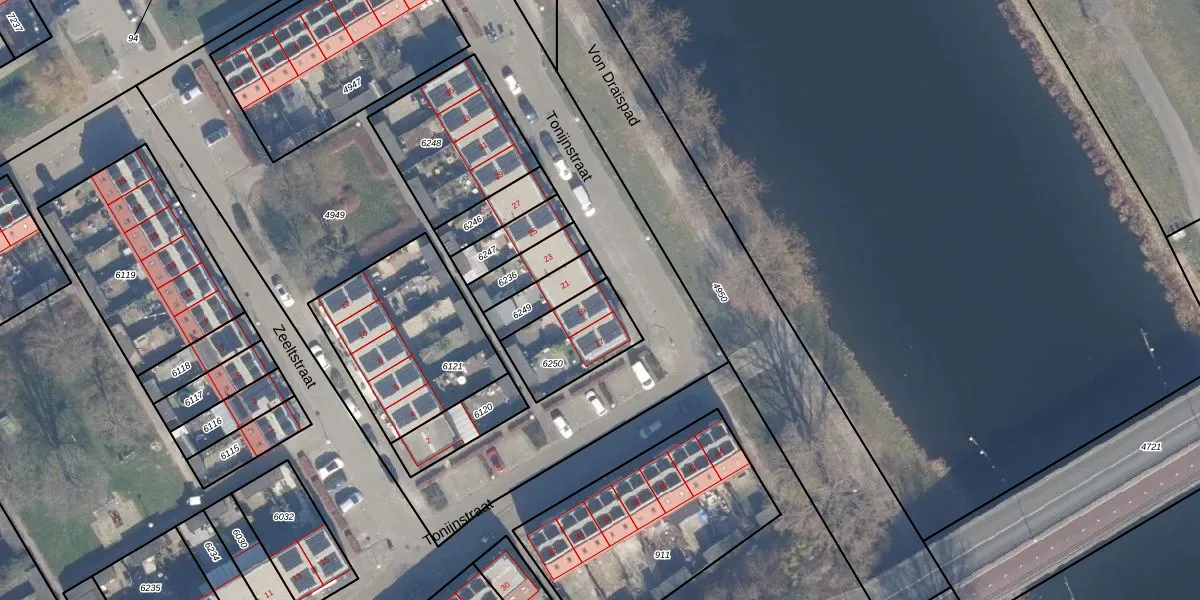 Het perceel waarop Tonijnstraat 19 staat heeft een oppervlakte van 249 m². Dit is een middelgroot perceel. De perceeloppervlakte wordt geregistreerd door het Kadaster. Gedetailleerde informatie over de maten van dit perceel kunt u vinden in het rapport Kadastrale kaart met maatvoering van Tonijnstraat 19.