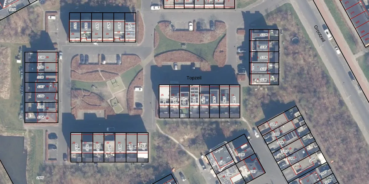 Het perceel waarop Topzeil 21 staat heeft een oppervlakte van 97 m². Dit is een klein perceel. De perceeloppervlakte wordt geregistreerd door het Kadaster. Gedetailleerde informatie over de maten van dit perceel kunt u vinden in het rapport Kadastrale kaart met maatvoering van Topzeil 21.