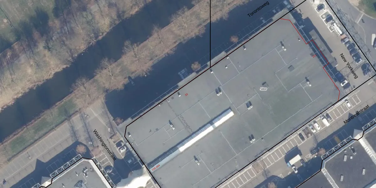 Het perceel waarop Torontoweg 53 staat heeft een oppervlakte van 6940 m². Dit is een zeer groot perceel. De perceeloppervlakte wordt geregistreerd door het Kadaster. Gedetailleerde informatie over de maten van dit perceel kunt u vinden in het rapport Kadastrale kaart met maatvoering van Torontoweg 53.