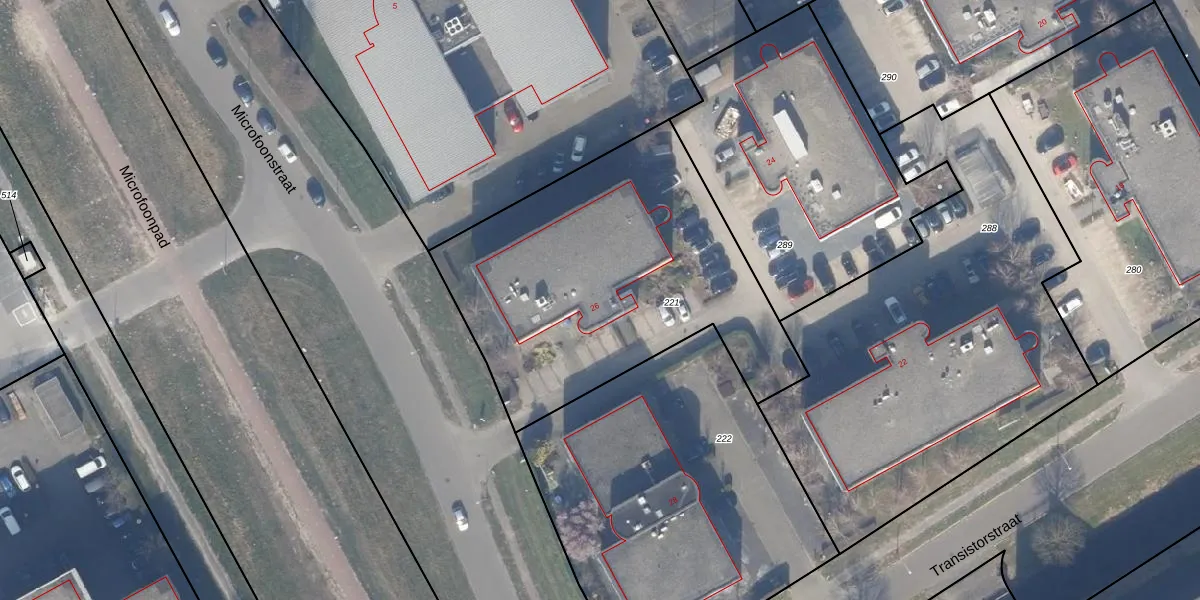 Het perceel waarop Transistorstraat 26 staat heeft een oppervlakte van 1700 m². Dit is een zeer groot perceel. De perceeloppervlakte wordt geregistreerd door het Kadaster. Gedetailleerde informatie over de maten van dit perceel kunt u vinden in het rapport Kadastrale kaart met maatvoering van Transistorstraat 26.